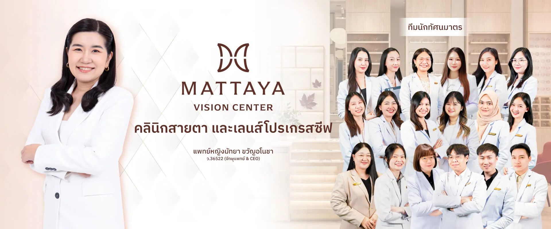 เรายกระดับการบริการให้ดีกว่าร้านแว่นตาทั่วไป สู่มาตรฐาน คลินิกแว่นโปรเกรสซีฟ แบบครบวงจร ทั้งคลินิกสายตาเฉพาะทาง และ เลนส์โปรเกรสซีฟ ที่ผสมผสานความเชี่ยวชาญทางการแพทย์ เข้ากับศิลปะการตัดแว่นแบบ Tailor Made ระดับ Premium ดูแลโดยทีมจักษุแพทย์และนักทัศนมาตร บริหารด้วยใจโดย แพทย์หญิงมัทยา ขวัญอโนชา (จักษุแพทย์ & CEO Mattaya Vision Center)