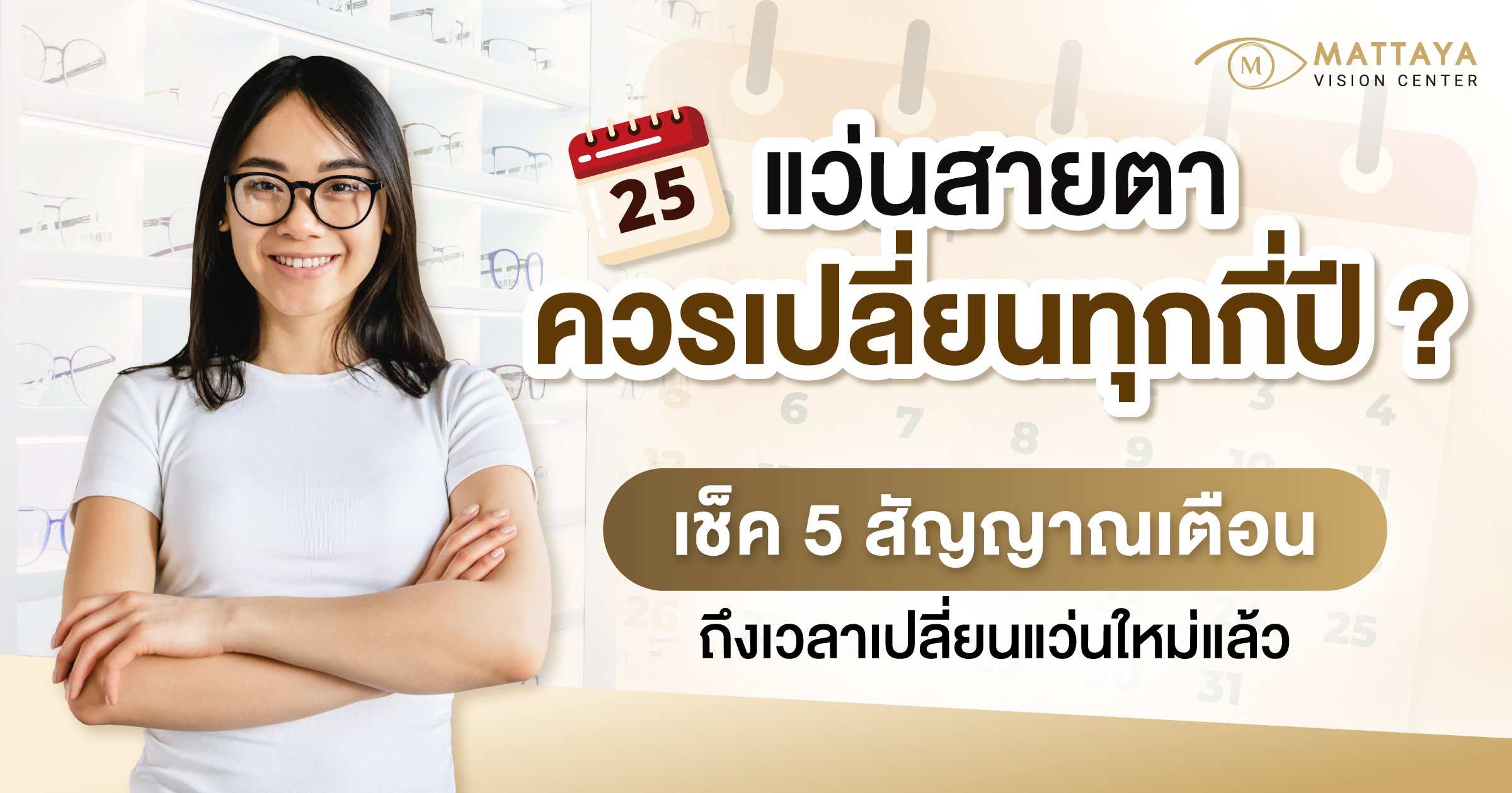 แว่นสายตา มักเปลี่ยนทุก 2-3 ปี ทั้งนี้อายุของการใช้งานขึ้นอยู่กับปัจจัยของเนื้อวัสดุเลนส์และกรอบแว่น รวมทั้งการดูแลรักษา นอกจากนี้ยังขึ้นอยู่กับผู้สวมใส่แว่นเมื่อมีอายุเพิ่มมากขึ้น ค่าสายตาก็เปลี่ยนแปลงตามเช่นกัน จึงทำให้ต้องมีการเปลี่ยนแว่นตาใหม่ หากเรามีอาการมองไม่ชัด เวียนหัว ปวดตา เลนส์มีรอยขีดข่วนเยอะ หรือรู้สึกว่าแว่นที่ใส่อยู่ไม่ตอบโจทย์การทำงาน ต้องการ Upgrade ให้ดีขึ้น เหล่านี้เป็นสัญญาณที่บ่งบอกว่าควรเปลี่ยนแว่นสายตาใหม่แล้ว